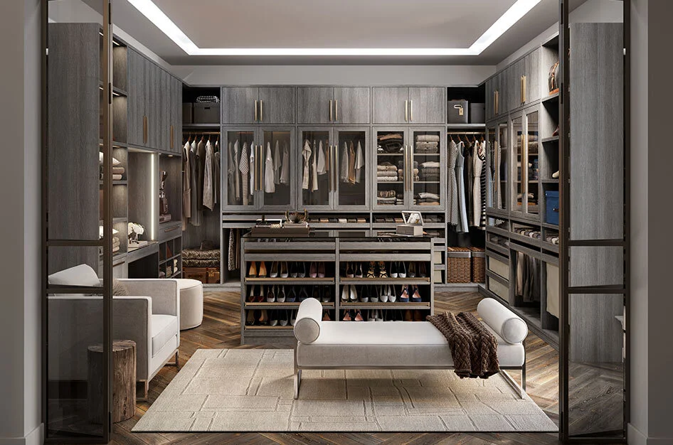 We added in some focal sconce lighting, tall mirrors to draw the eye up and a center cabinet for additional storage and functionality. We opted for floating shelves in the vanity as well as near the shower for display space and easy accessibility to towels and bathroom accessories. Since we grew the size and space within the shower, we had extra room for a floating, focal bench made from our countertop quartz. We also custom designed niches for shampoo and soap storage.